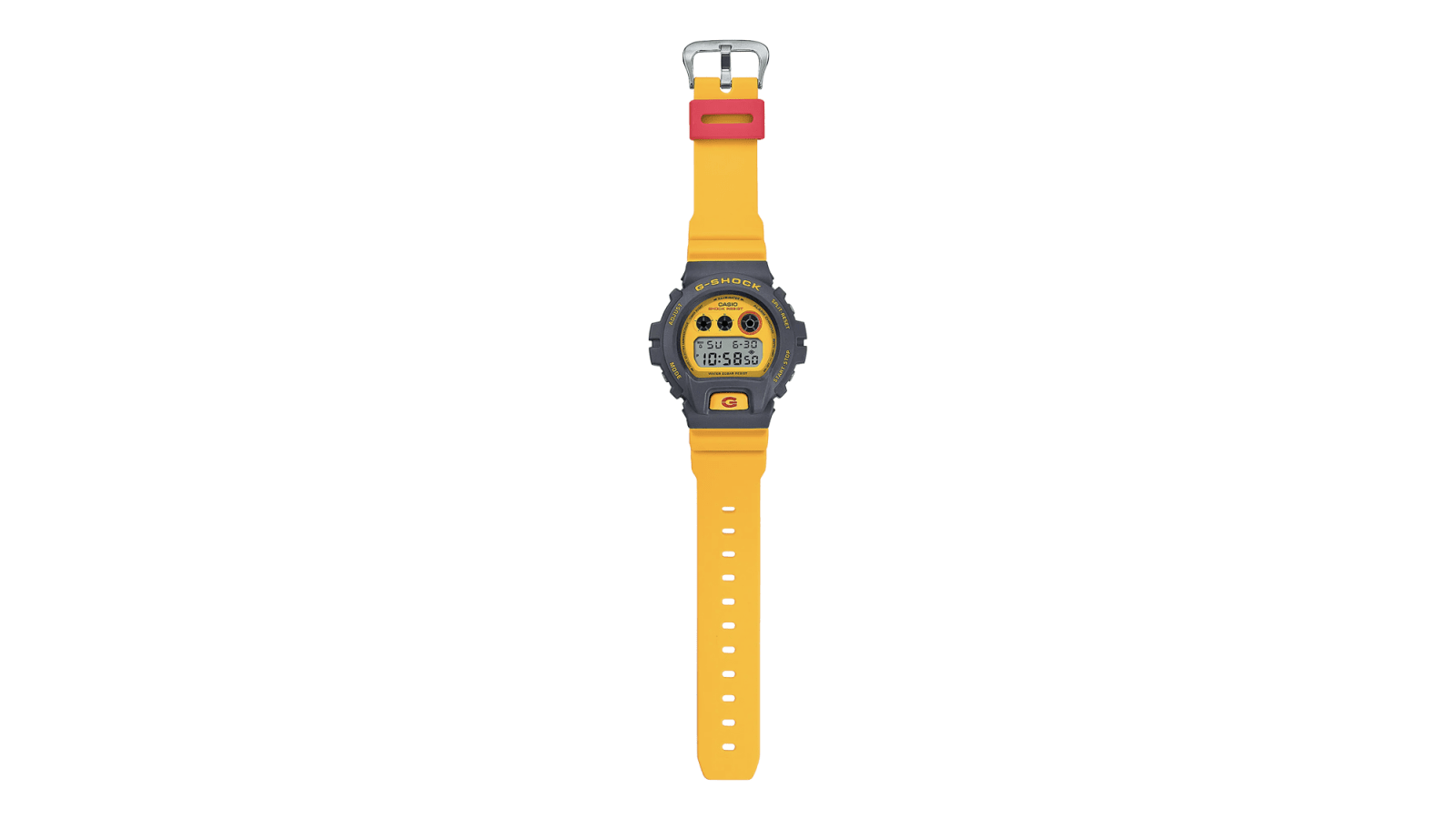 The G-Shock DW-6900Y-9 is a direct callback to the bright ‘90s color scheme of one of the original G-Shocks (DW001), but re-imagined here with a contemporary style. It includes a yellow dial and band + a slate gray bezel.