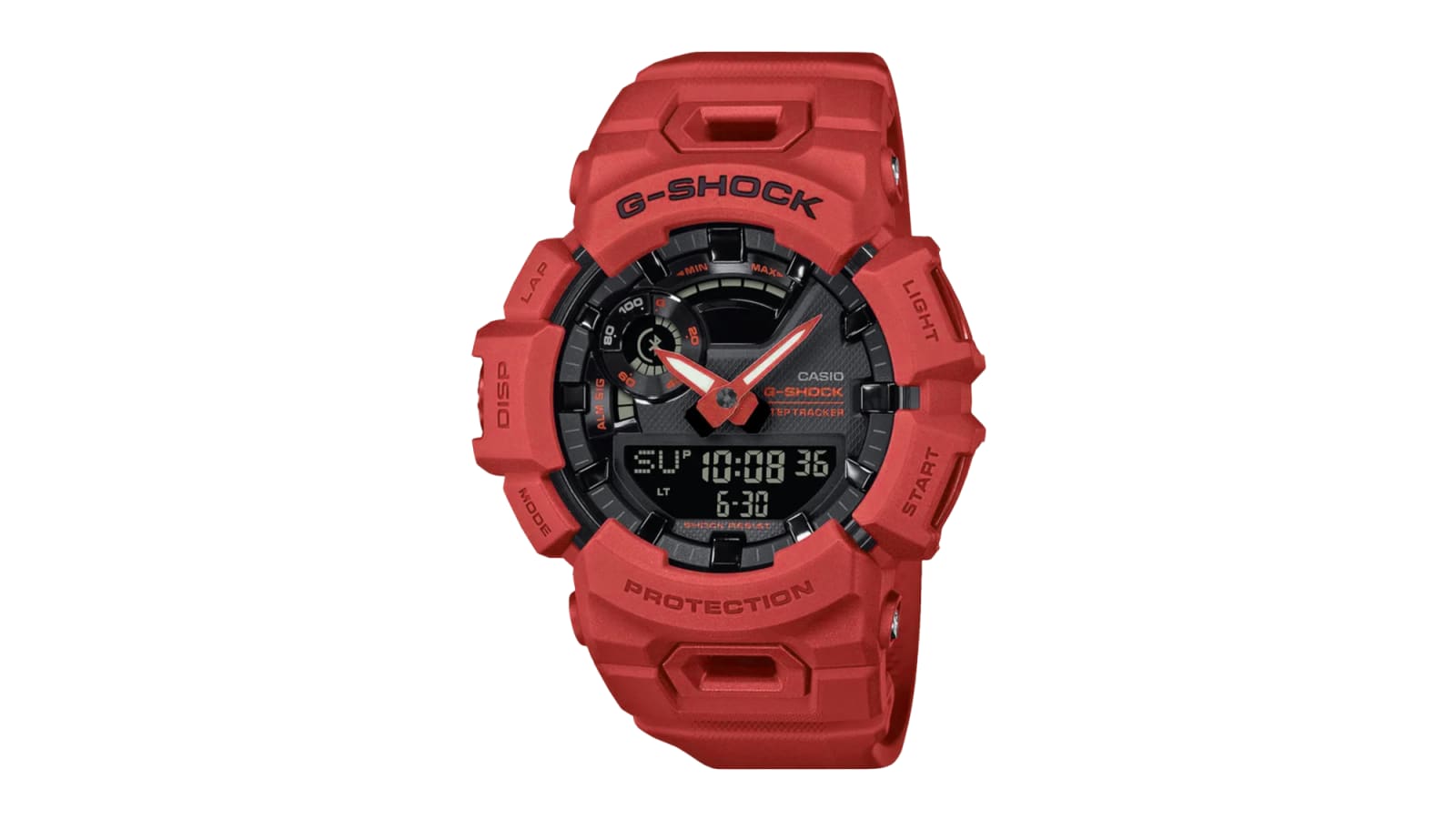 Part of the G-Shock MOVE series, the GBA900RD-4A watch features a vibrant red bezel with a black dual analog/digital dial. This model also includes new smartphone-link and Step Tracker functionality.