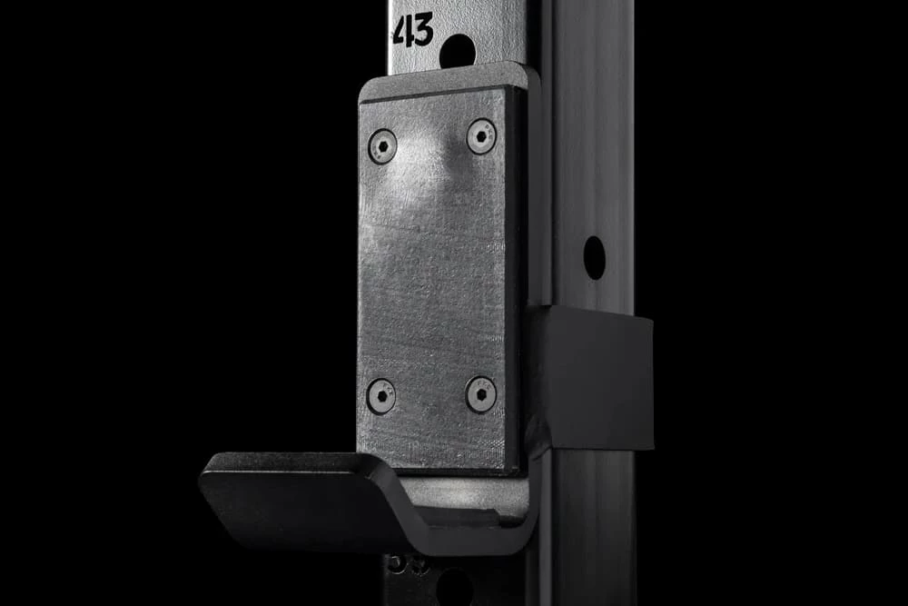 As with all past models, Version 3.0 of the RML-490C Rack is manufactured in Columbus, Ohio, and features 90” tall uprights with laser-cut holes in the Westside pattern (1” through bench and clean pull zone, 2” spacing above and below). A full line-up of accessories also come standard with the 43” depth unit, including a set of Monster Lite J-Cups, Pin/Pipe Safeties, Band Pegs, and a 43” Single Pull-Up Bar. An optional stabilizer (in a matte black powdercoat finish) can be added to an order via the dropdown menu.