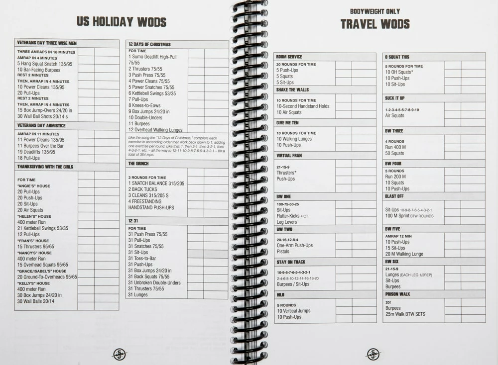 The Rogue WODbook comes standard with “double” logging (two entries per page) for about 150 workouts per book. The movement standards and PR tracking are combined into one section.