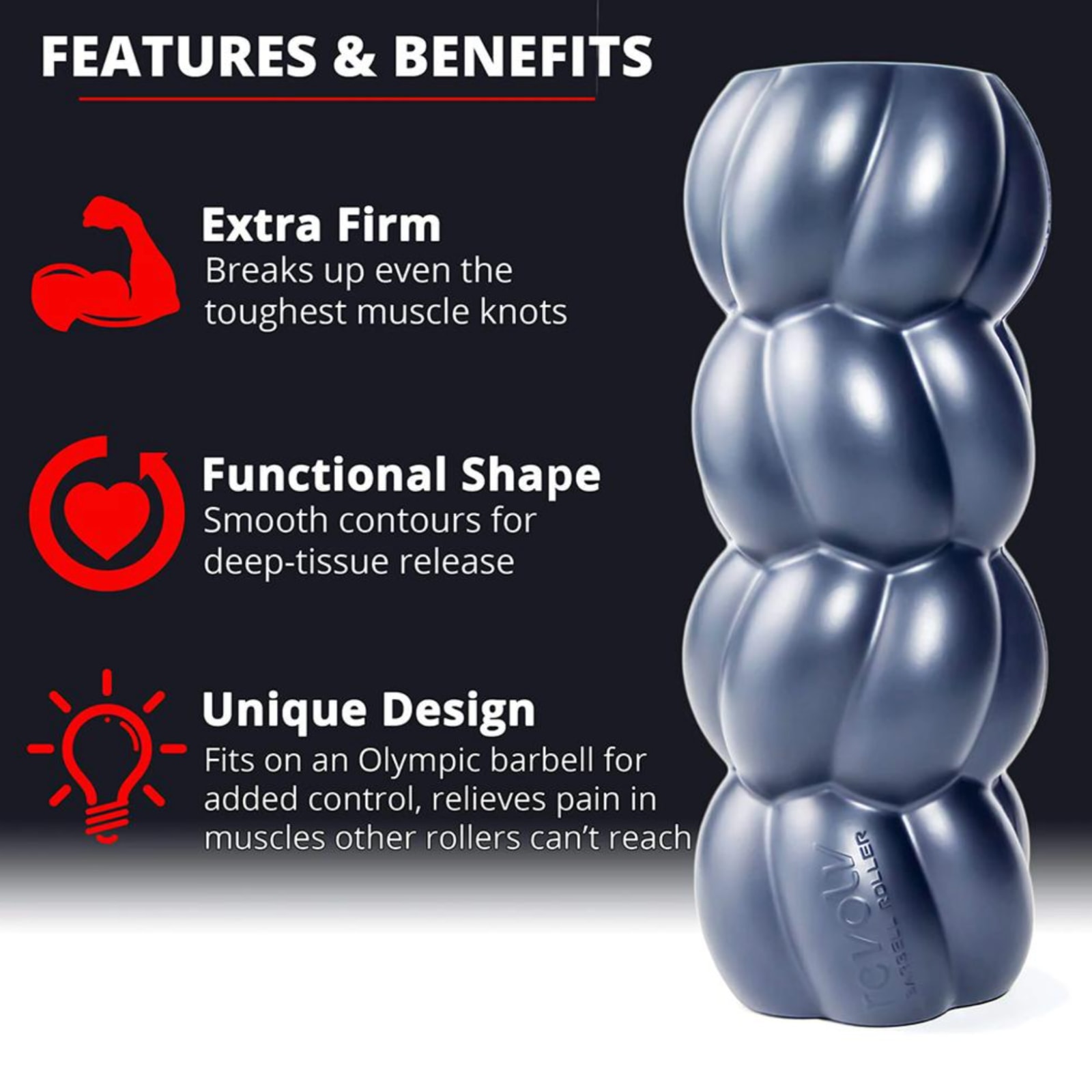 The Revolv Barbell Roller’s contoured shape is designed for targeted, deep tissue massage, with a firm construction that’s more dense than a standard foam roller, but softer than a lacrosse ball. Regular use can help break up nagging knots, reduce muscle pain, improve flexibility, stimulate blood flow, and speed up recovery times.