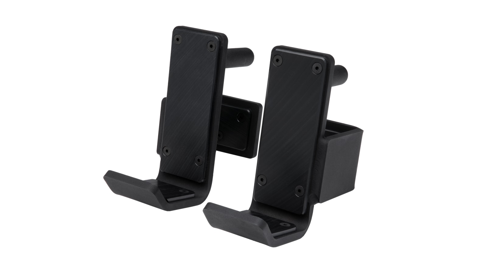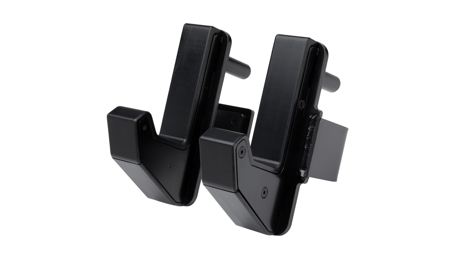 Monster 2” Sandwich J-Cups: 2” width, 10” height, ⅜” plate steel, 20 LB The side plates fit into a recessed, machined plastic core (2″ wide) to prevent metal-to-metal contact. The hardware (that connects the plastic to the side plates) is also recessed, preventing the bar or a user’s hand from scraping against them. Welds are insides the side plates for a clean edge, and UHMW plastic is featured on the clasp and back plate to prevent damage to the uprights. A thin piece of rubber on the side of the clasp also softens contact between the clasp and upright when the J-Cup is swung into place.