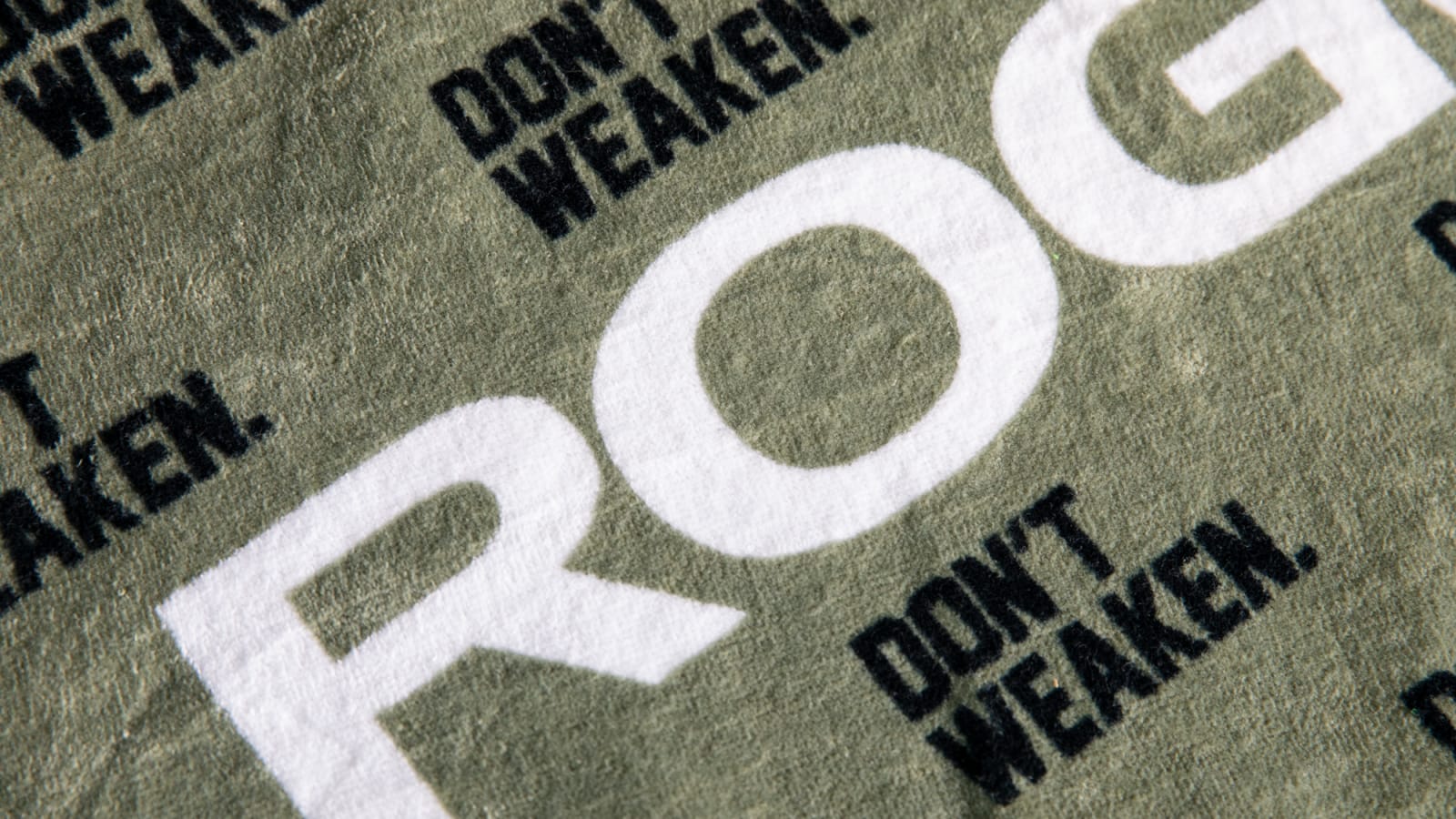 The towel is available here in white with the Rogue logo and “Don’t Weaken” mantra printed in black. See the purchase area for more color options.