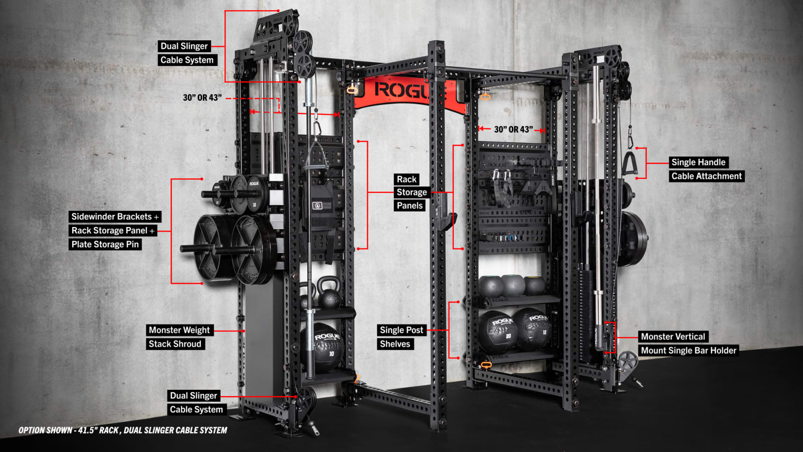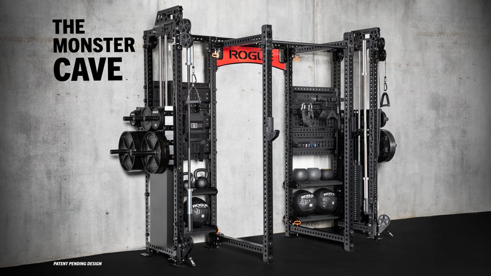 The Monster Cave is manufactured in the USA and features 3×3” 11-gauge steel with an MG Black finish, 1” Monster hardware, and laser-cut holes spaced 2” on center. Customers can select the height of the uprights (90” or 100”) and the depth and configuration of the central Fold Back Rack, which is available as either a full 4-post power rack (24” or 30” depth) with included strap safeties or a standard 2-post fold-flat (21.5” or 41.5” depth). Building on the modular design of the Reflex Racks, the Monster Cave is also compatible with multiple different storage options, from Rack Storage Panels and specialized shelves to new side side winder that make it possible to use the real estate on the outsides of the weight stack Slingers for additional storage.